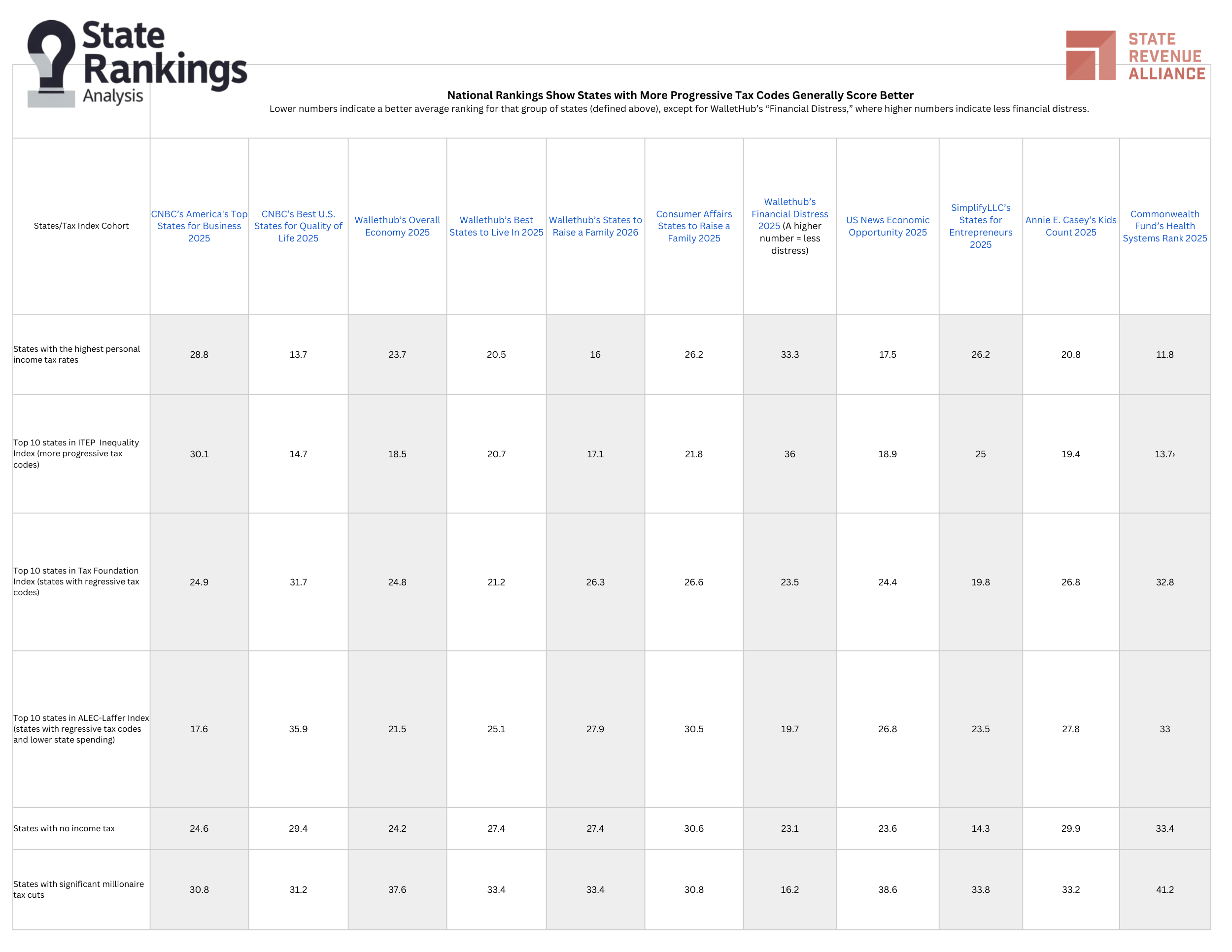 Eleven national rankings are listed across the table. They are nationally recognized aggregators of census and other public information that compare the 50 states. The numbers are the average score for that grouping, defined below, on a 1-50 state ranking. These rankings do not include the District of Columbia or any other U.S. territory.